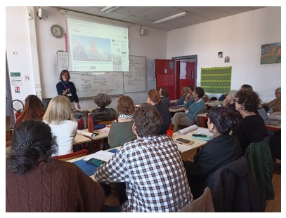 Elisabeth Saint Blancat, Pauline Pujo, Marie-Pierre Aubague et Stéphane Raymond ont présenté plus en détail quelques uns de leurs documents pédagogiques, avant que les participants ne se répartissent en petits groupes pour analyser et didactiser différentes chansons selon les niveaux. La mise en commun finale a permis de croiser les approches et d’enrichir les pratiques de chacun.