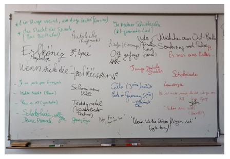 Les titres et interprètes évoqués ont été recensés au tableau, constituant ainsi une playlist collective riche d’idées pour nos cours de collège et de lycée.